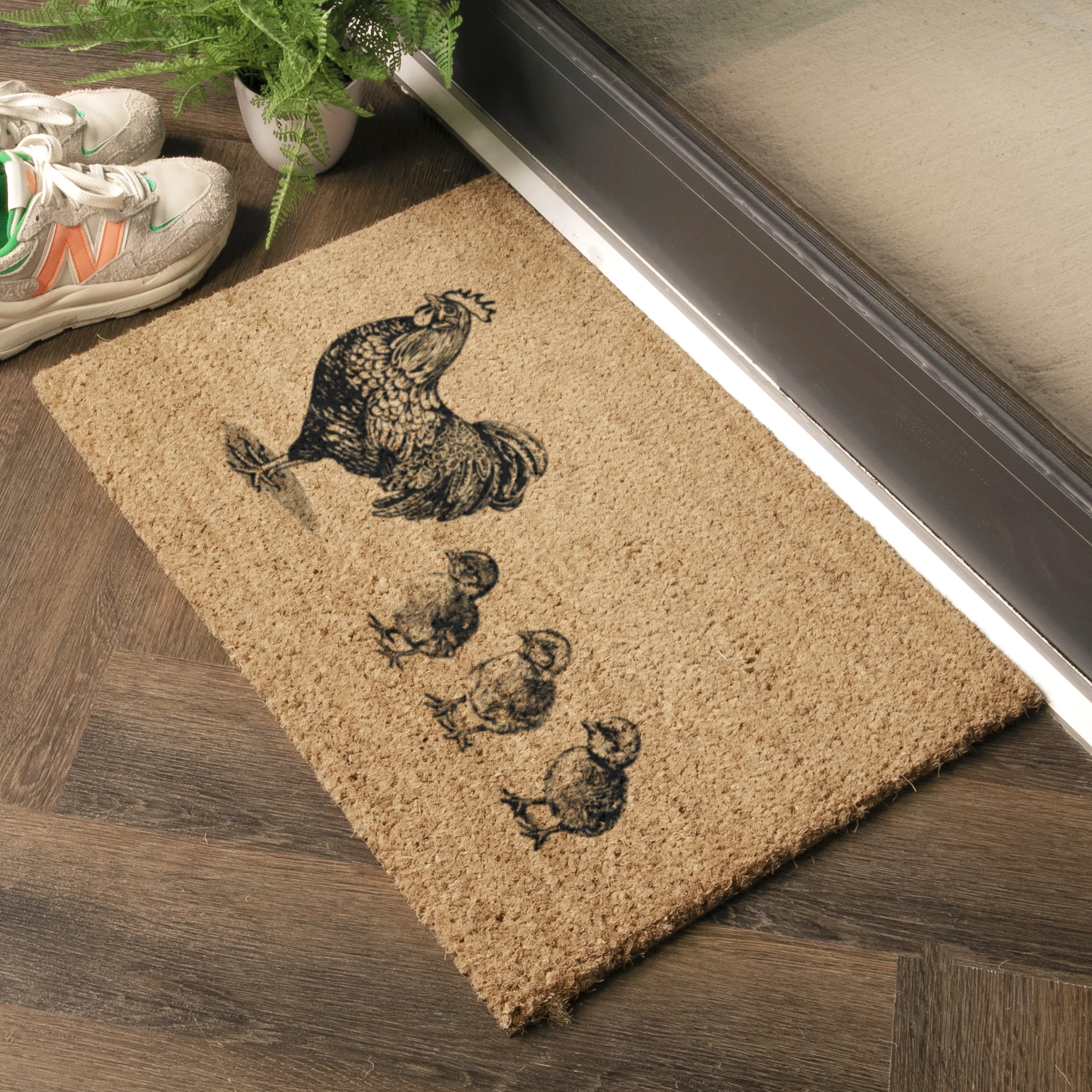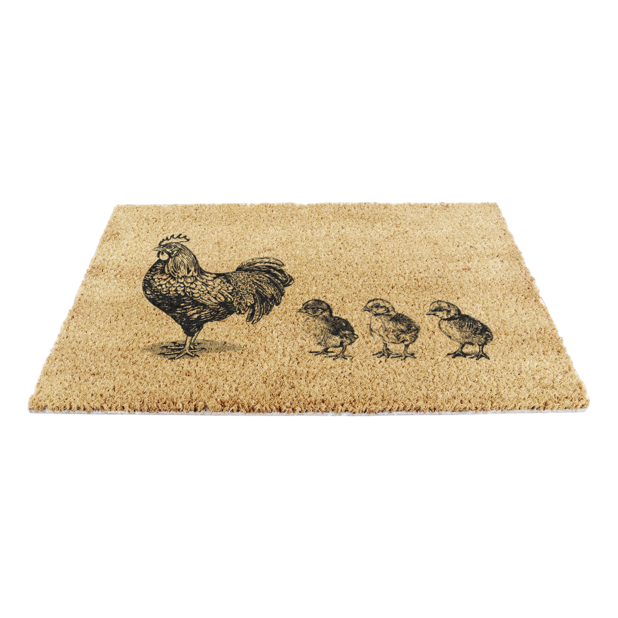 Add playful farmyard charm to your doorway with the Chicken with Chicks Coir Doormat. Featuring a delightful illustration of a hen with her chicks, this mat brings warmth and personality to your entrance while keeping floors clean.