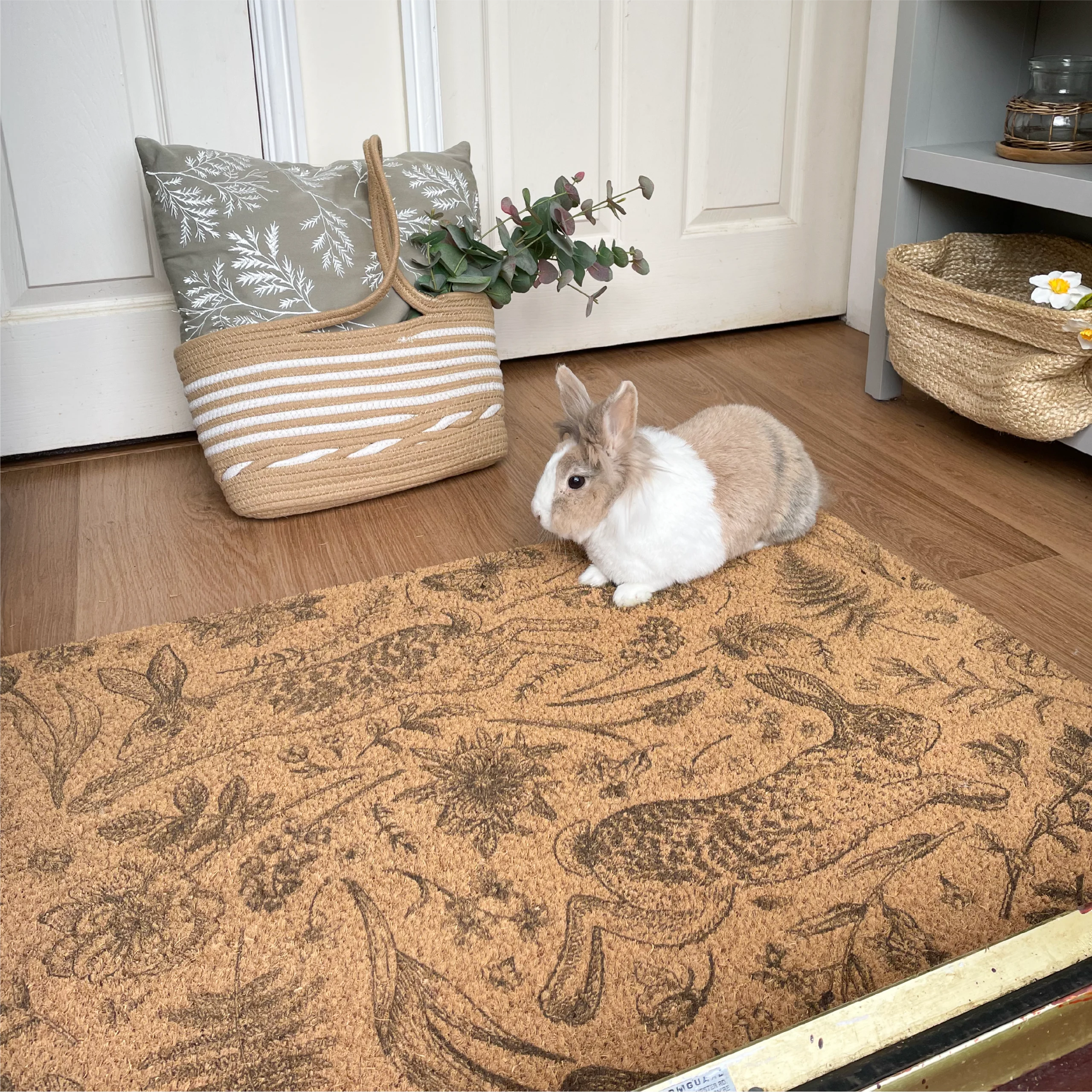 Bring a touch of woodland charm to your doorway with the Hare Print Coir Doormat. Featuring a beautifully illustrated hare surrounded by delicate botanicals, this mat adds sophistication and personality while helping to keep floors clean.